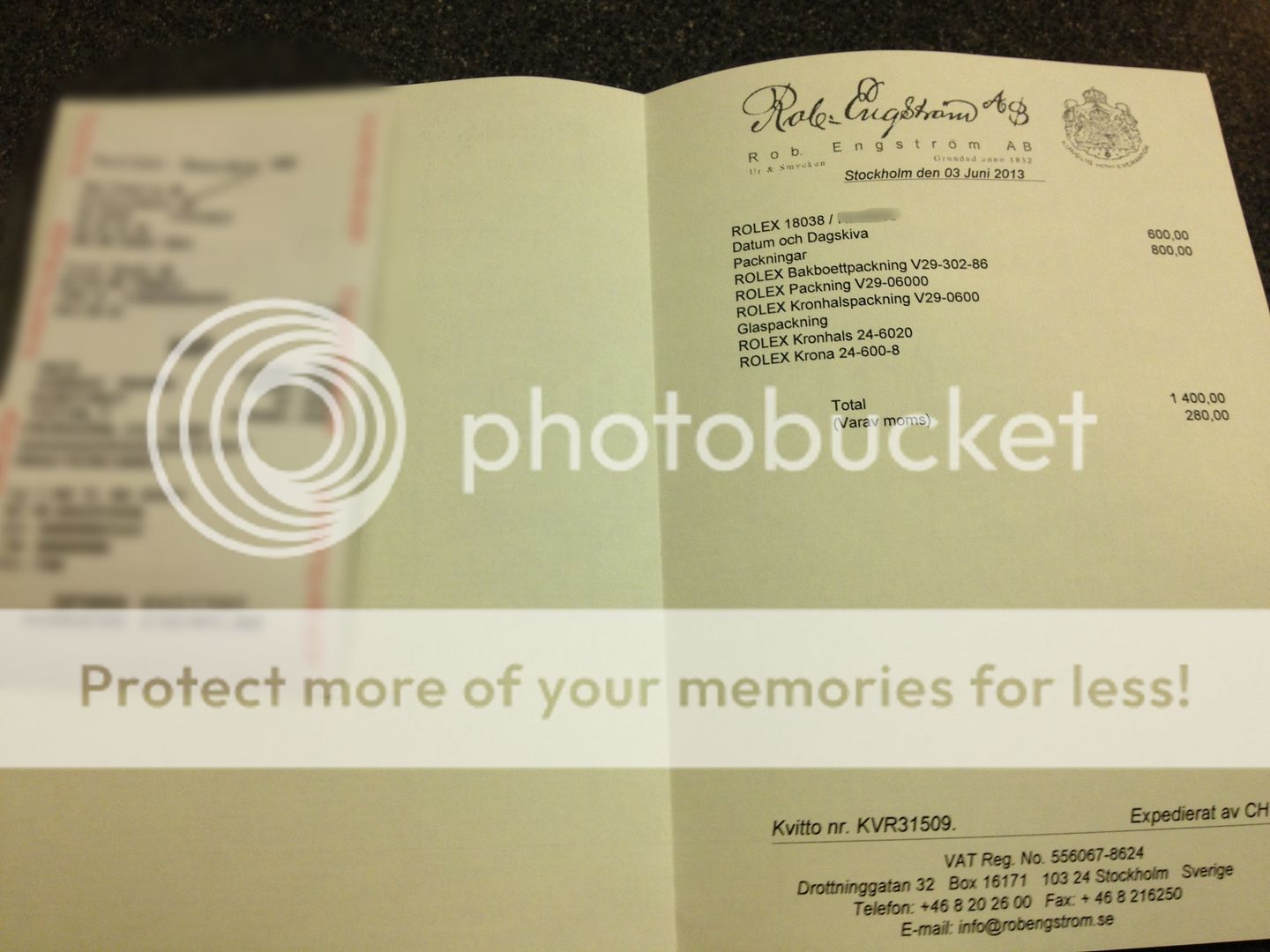 Jag har haft klockan på kontroll hos Rob. Engström i juni 2013. I samband med det gjordes en komplett packningsservice samt dag- och datumskivebyte till vit färg. Kvitto finns.